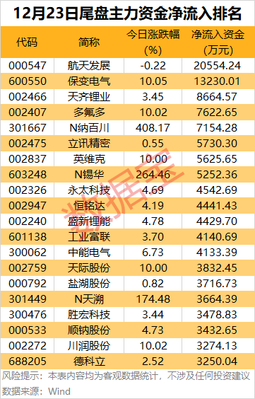 个股方面,航天发展、保变电气尾盘主力资金分别净流入2.06亿元、1.32亿元;天齐锂业、多氟多、N纳百川、立讯精密、英维克尾盘主力资金净流入也居前。