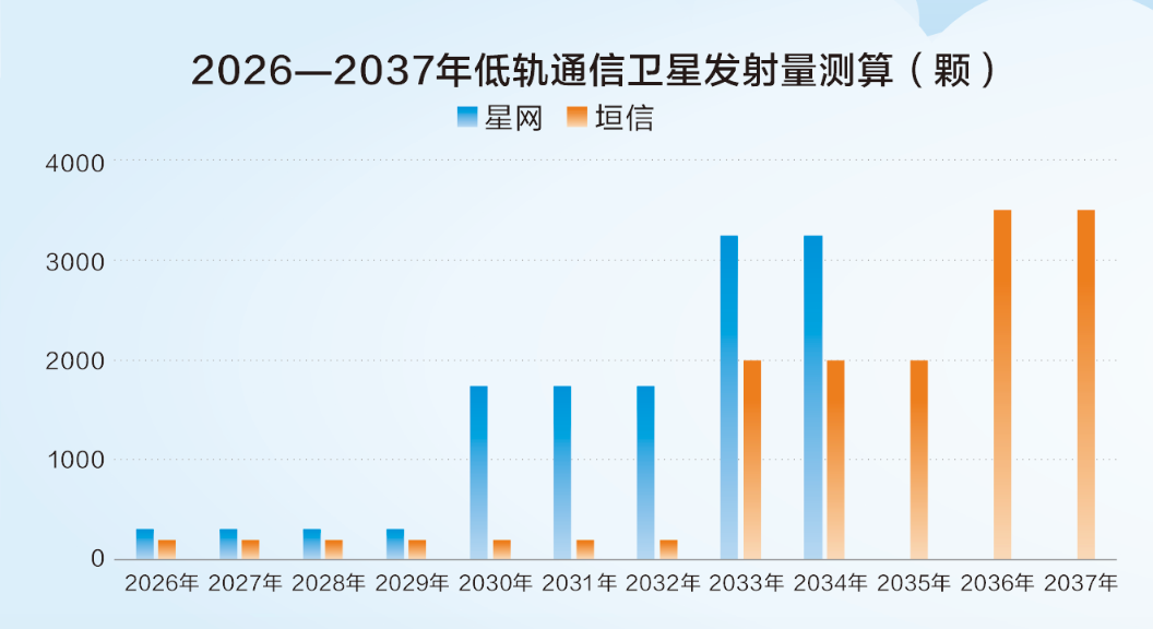 根据国际电信联盟预测的发射节奏,预计“国网星座”2026~2029年发射约1200颗卫星,2030~2032年发射5200颗,2033~2034年发射6496颗;预计“千帆星座”2026~2032年发射1392颗,2033~2035年发射6000颗,2036~2037年发射7500颗。这意味着,自2030年起,每年卫星发射数量较此前将有数倍增长。