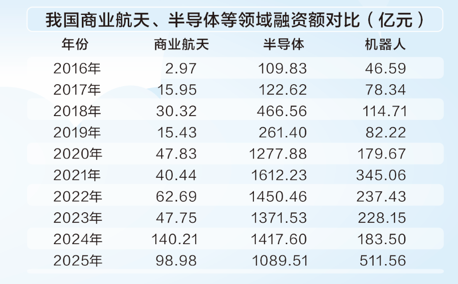 然而,对比近十年我国半导体领域超9000亿元的融资额,机器人领域超2000亿元的融资额,商业航天的融资额远低于上述两者。已启动IPO的SpaceX公司,拟募资额或远超300亿美元,我国商业航天的融资力度明显不足。