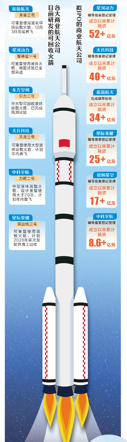 包括上述5家公司及微纳星空在内,6家企业累计融资额合计超170亿元,其中天兵科技、星河动力融资额均超过40亿元。业内人士指出,商业航天企业产品快速落地,是其短期内完成多轮融资的核心支撑。