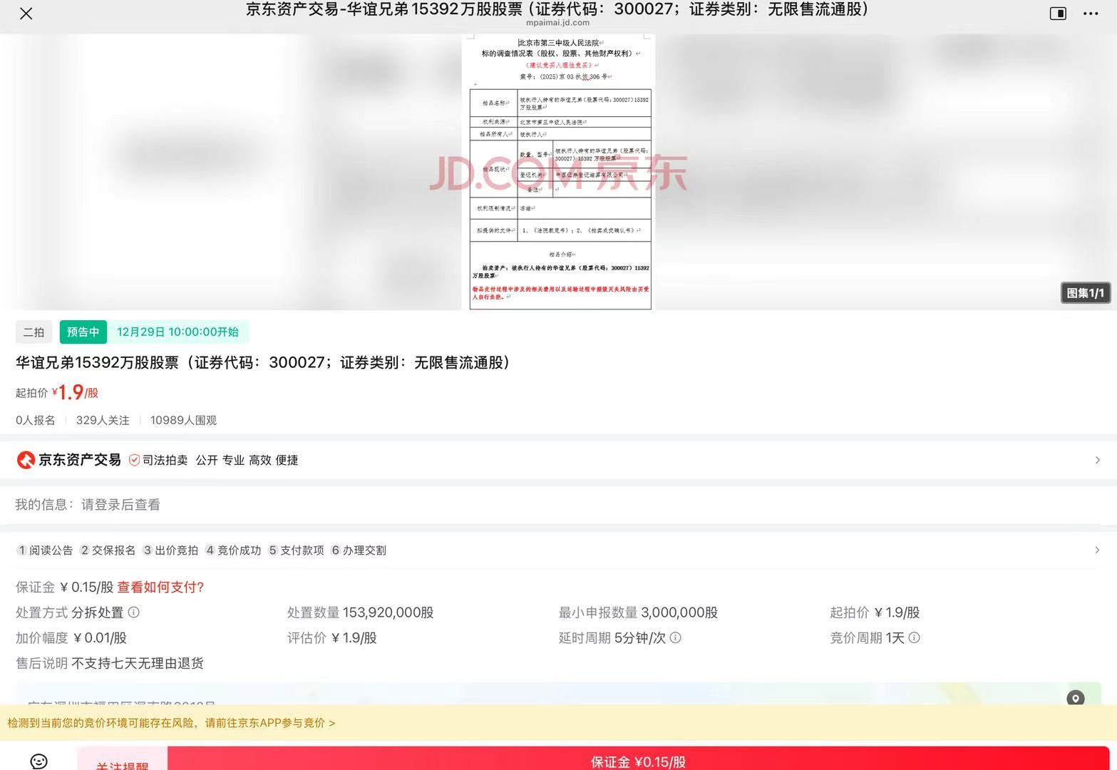 此外,界面新闻从京东网司法拍卖平台获悉,公司实控人王忠军持有的上市公司华谊兄弟15392万股无限售流通股股票将于12月29日上午10:00开始二拍,起拍价1.9元/股,总计约2.924亿元;要求保证金为0.15元/股,加价幅度为0.01元/股,最小申报数量为300万股。