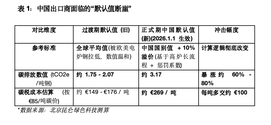 周熙邦对界面新闻解释称,根据最新的文件披露,欧盟为了“惩罚”不提供实际数据的出口商,将2026年正式实施期的默认值逻辑从“全球平均”修改为“国别平均+惩罚性溢价”。