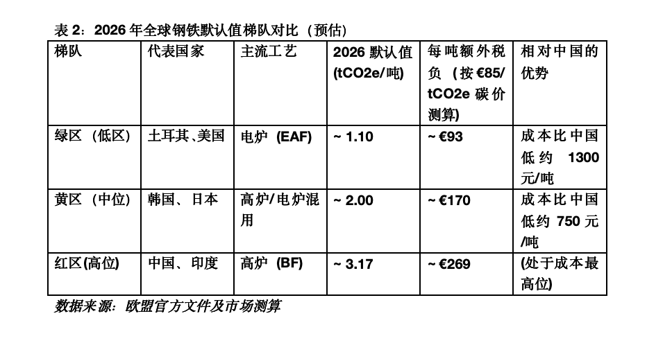 界面新闻获取的一份《2026年全球主要钢铁出口国CBAM默认值梯队表》显示,与竞争对手相比,中国企业的“默认值成本”处于塔尖位置。