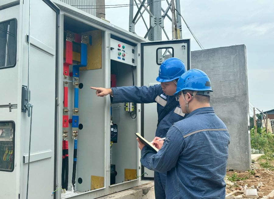 佛山供电局九江供电所用检人员正在验收储能装置接线情况。图片拍摄/林咏菁
