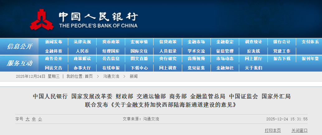 为完善西部陆海新通道金融服务体系,中国人民银行等八部门12月24日联合发布《关于金融支持加快西部陆海新通道建设的意见》(下称《意见》),要求充分发挥好“融资”和“结算”两项金融核心功能,全面完善西部陆海新通道金融服务体系,显著增强跨省(区、市)、跨境金融要素配置能力。