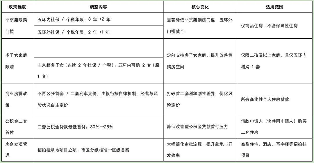 该《通知》明确,为更好满足居民刚性住房需求和多样化改善性住房需求,进一步优化调整住房限购政策,比如放宽对“非京籍新市民”与“多子女改善家庭”的限购、金融端利率与首付双减。