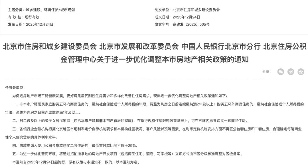 12月24日,北京市住房城乡建设委、市发展改革委、人民银行北京市分行、北京住房公积金管理中心等4部门联合印发《关于进一步优化调整本市房地产相关政策的通知》(下称《通知》)。
