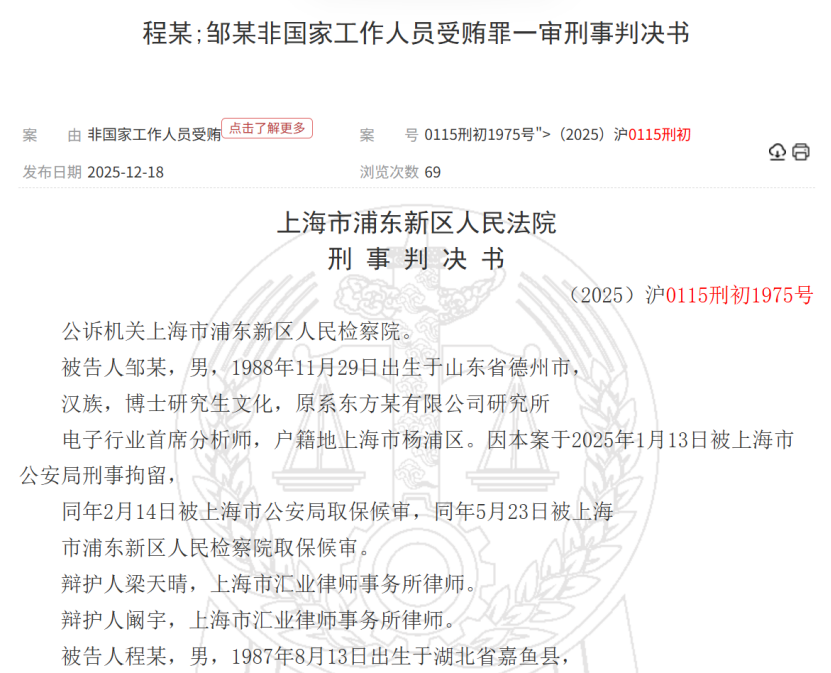 判决书显示,被告人邹某,男,1988年生,博士研究生文化,原系东方某有限公司研究所电子行业首席分析师;被告人程某,男,1987年生,汉族,硕士研究生文化,原系东方某有限公司研究所电新行业高级分析师。