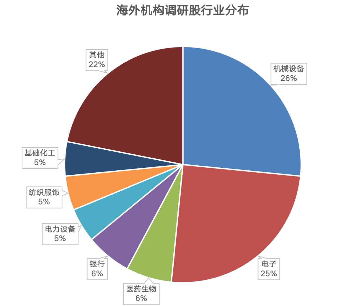 分行业来看,近期海外机构调研股主要集中于机械设备、电子两个行业,分别有17只个股、16只个股,此外医药生物、银行各有4只个股。热门概念中,机器人、AI算力、芯片等概念股出现较多。