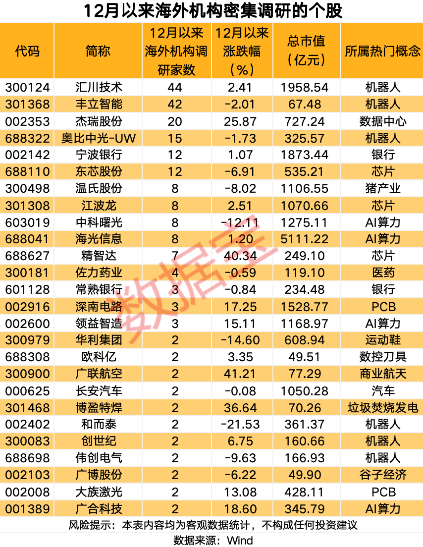 人民财讯12月25日电,根据调研日期截止日统计,12月以来,共有69股获得海外机构调研,其中获5家及以上海外机构调研的共有11只个股,汇川技术、丰立智能、杰瑞股份获海外机构调研家数最多,分别达到44家、42家、20家,其中汇川技术、丰立智能均具有机器人概念。