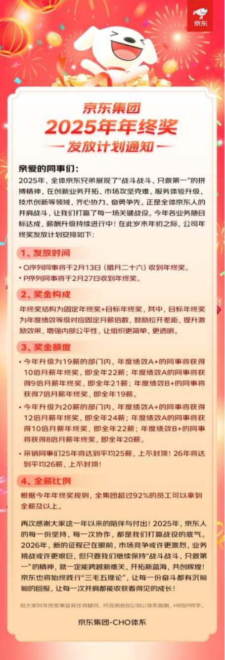 据透露出来的公告:今年升级为19薪的部门内,年度绩效A+的员工将获得10倍月薪年终奖,即全年22薪;年度绩效A的员工将获得9倍月薪年终奖,即全年21薪;年度绩效B+的员工将获得7倍月薪年终奖,即全年19薪。而在今年提前实现20薪的部门内,年度绩效B+的员工即可拿满8倍月薪年终奖,即全年20薪,年度绩效A+将直接获得12倍年终奖,全年24薪。京东采销今年将实现平均25薪,上不封顶。