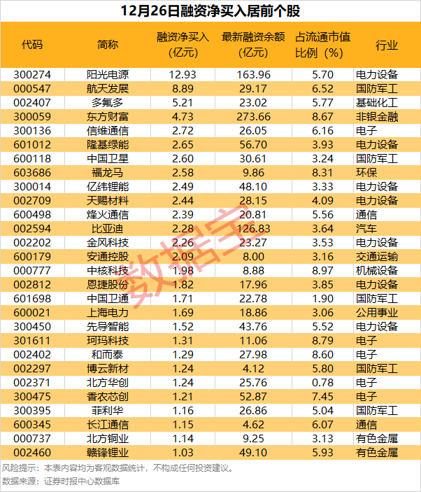 具体到个股,12月26日获融资净买入千万元以上的有468只,其中28只融资净买入额超1亿元。阳光电源融资净买入额居首,当日净买入12.93亿元,其次是航天发展、多氟多,融资净买入金额分别为8.89亿元、5.21亿元,融资净买入金额居前的还有东方财富、信维通信、隆基绿能等。