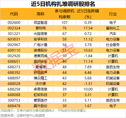 近5个交易日(12月22日至12月26日)约172家公司被机构调研,其中,16家公司获30家及以上机构扎堆调研。领益智造最受关注,参与调研的机构达到107家;普利特被76家机构调研,榜单中排名第二;光庭信息、安孚科技等分别被67家、58家机构调研。