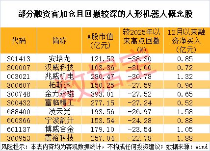 证券时报·数据宝统计,截至12月26日收盘,12月以来融资净买入超5000万元的人形机器人概念股有23只。这23只人形机器人概念股中,12月26日收盘价与年内高点相比,回撤幅度超20%的有10只。3股回撤幅度超过30%,分别为安培龙、汉威科技、兆威机电。