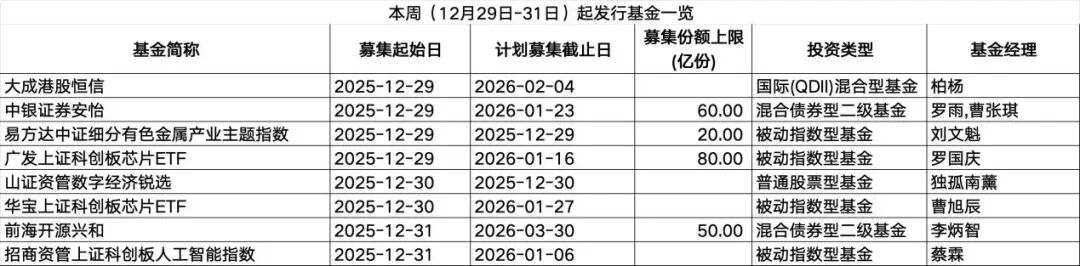 本周只有三个交易日,12月29日是新基金发行的关键日,本周8只新发基金中4只集中在周一启动发行;周二、周三各有2只新基金启动募集。