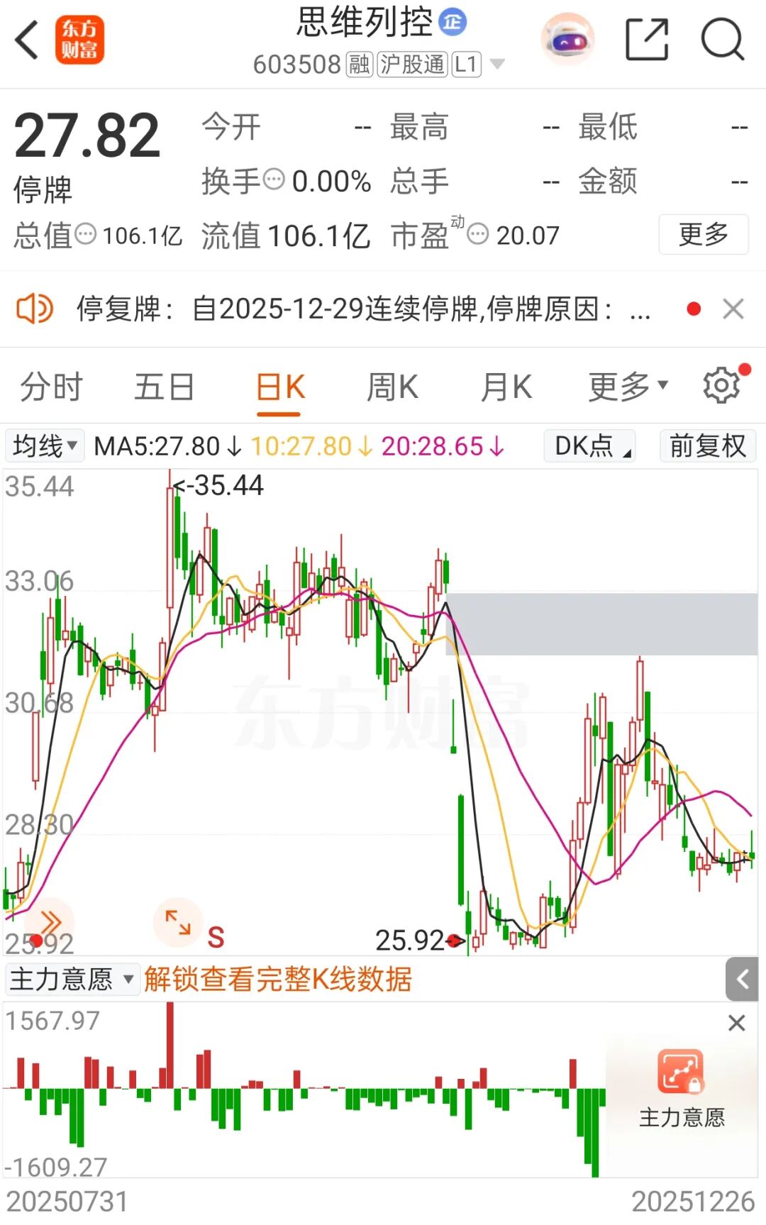 截至停牌前最后一个交易日(12月26日),思维列控报27.82元/股,下跌0.43%,总市值为106亿元。
