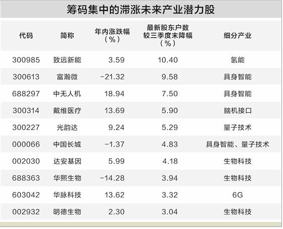 进一步来看,上述股东户数降幅超过3%的27家公司中,截至12月29日,年内涨幅低于19%的公司仅有10家。上述10家公司的股票或有望成为未来产业赛道中具备补涨潜力的标的。