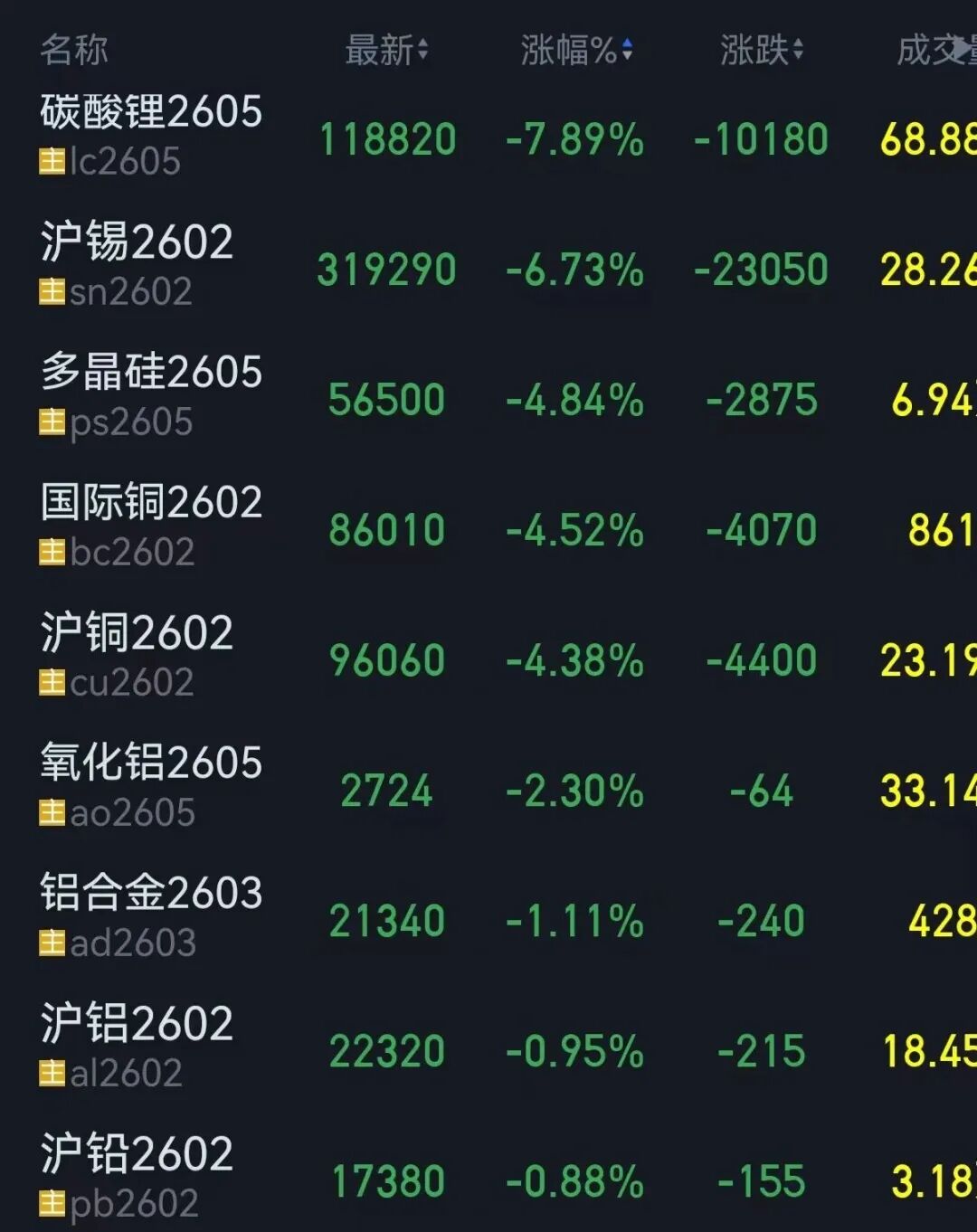 截至收盘,COMEX黄金期货价格跌4.45%,报4350.2美元/盎司;COMEX白银期货价格跌7.2%,报71.64美元/盎司。现货白银价格大跌近9%,现货钯价格跌超15%,现货铂价格跌超14%。