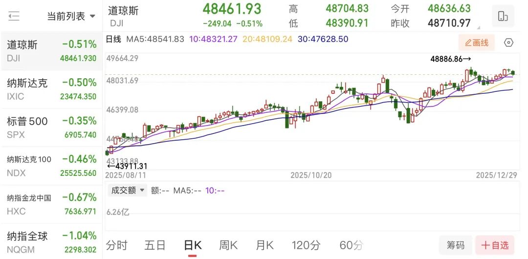 在2025年接近尾声之际,美股在年末交易中出现小幅回落。
