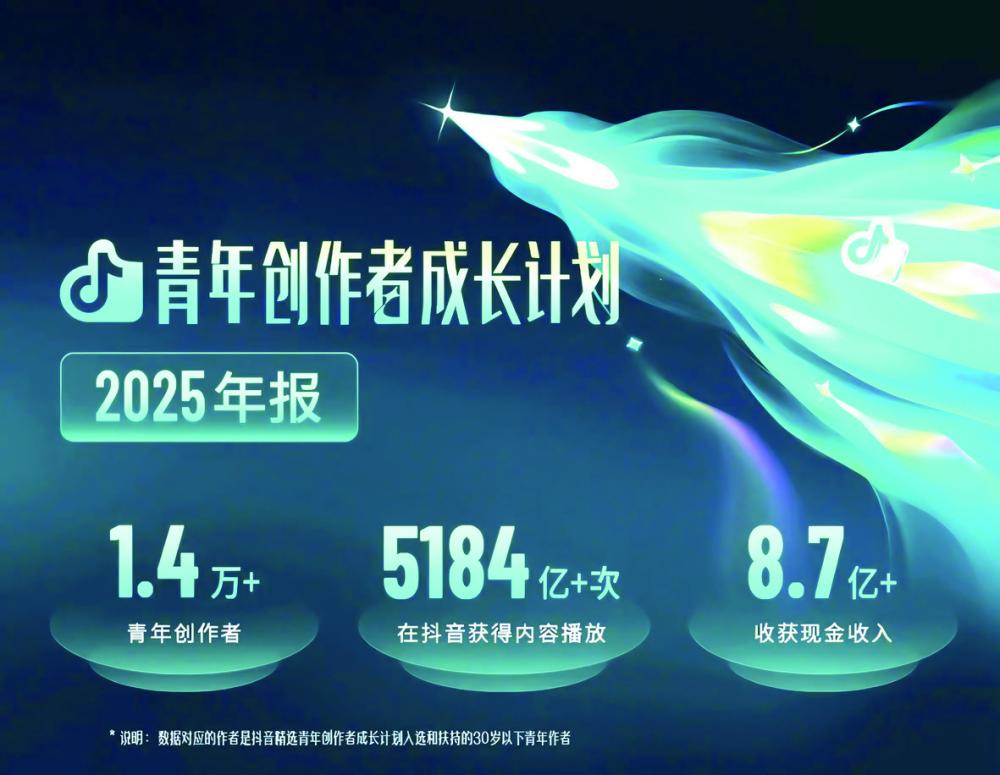 2025年收官之际,抖音精选青年创作者成长计划(下称“青创计划”)交出亮眼成绩单:1.4万名青年创作者通过该计划获得超8亿元现金收入,作品累计播放量突破5000亿次,260位作者跻身“百万粉丝俱乐部”,1590人粉丝量破十万。