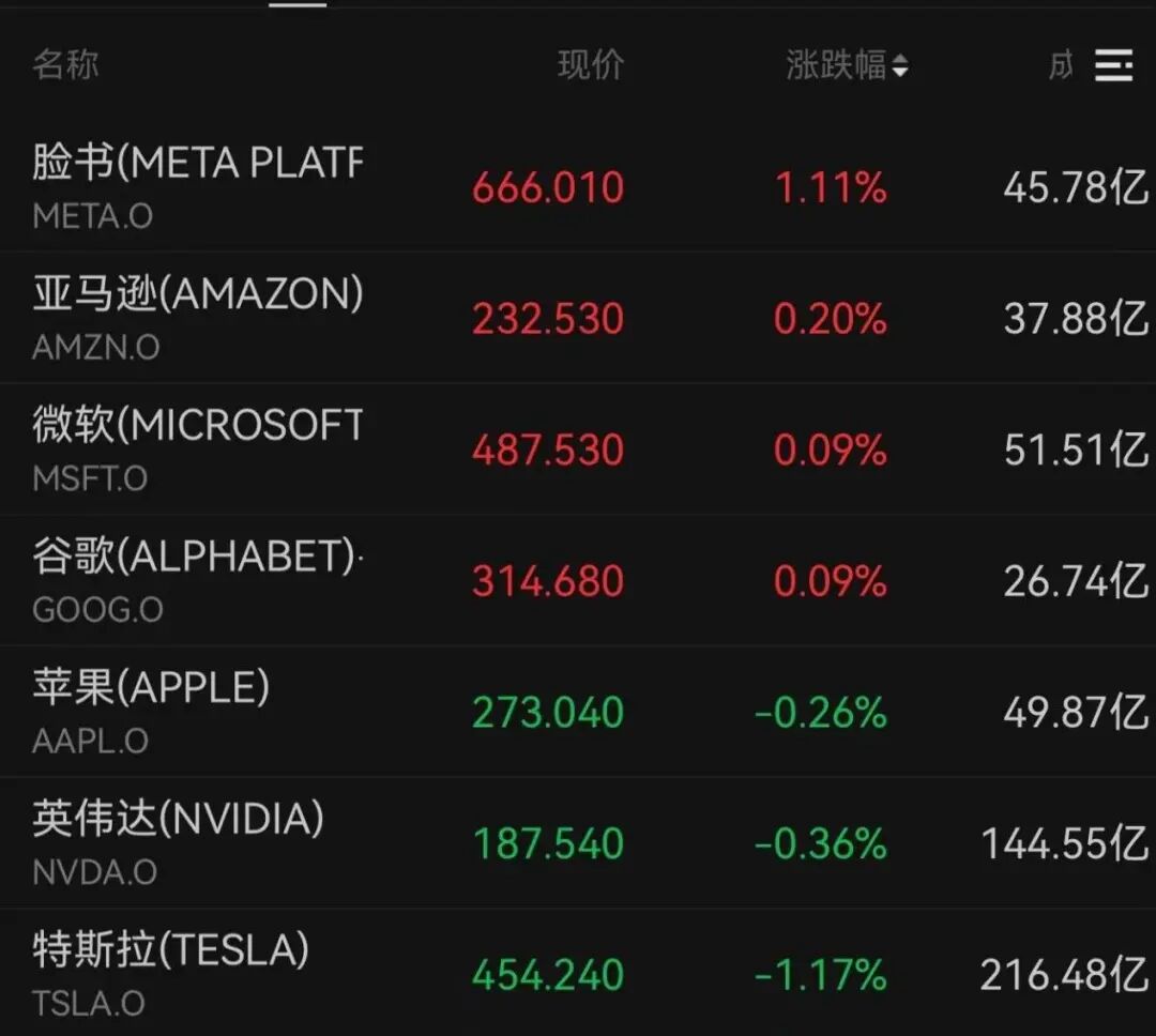 大型科技股涨跌不一。脸书涨幅超过1%,亚马逊、微软、谷歌小幅上涨0.20%、0.09%、0.09%;特斯拉下跌1.17%,苹果、英伟达均收跌。