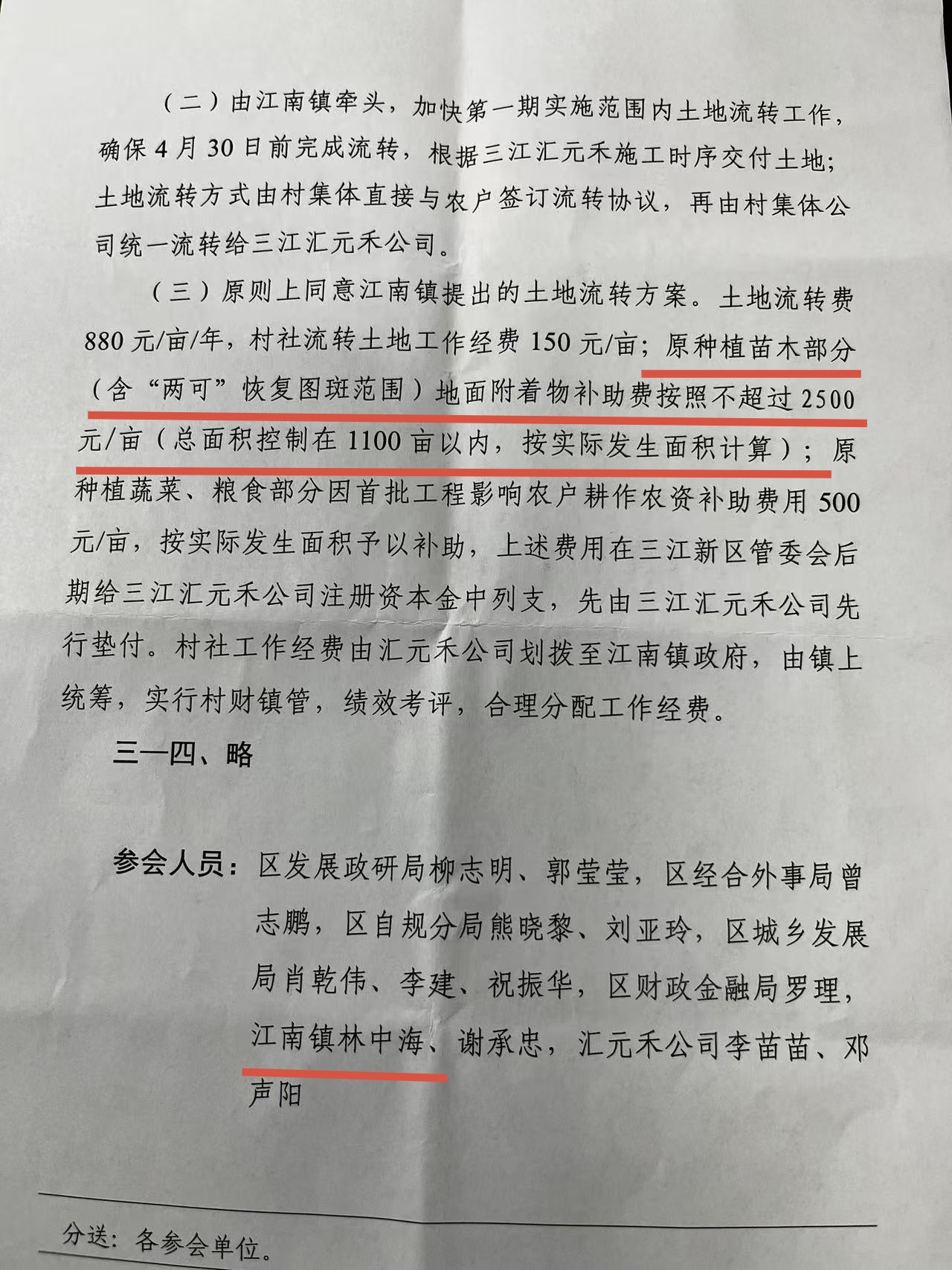 这份会议纪要中对地面附着物明确了补助标准,江南镇镇长林中海参会。受访者图