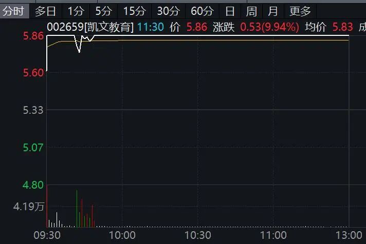 人工智能概念早间集体走强,智谱AI方向领涨,板块指数高开高走,放量大涨逾2%,连续第6日上涨。凯文教育高开后秒速涨停,德生科技也仅约10分钟直线涨停,蓝色光标(300058)临近午间收盘20%涨停。