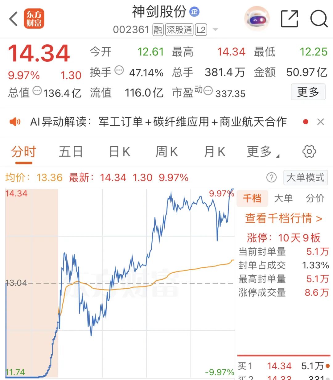 今日午后,商业航天概念股大幅拉升。联创光电直线封板,用时仅1分钟;中国卫通、航天电子随后也陆续涨停。而临近尾盘时分,“大牛股”神剑股份也被拉升至涨停板,录得10天9板。截至下午收盘,通达信商业航天指数整体涨幅接近2%,再创历史新高,涨停或涨幅超过10%的相关概念股接近30只。