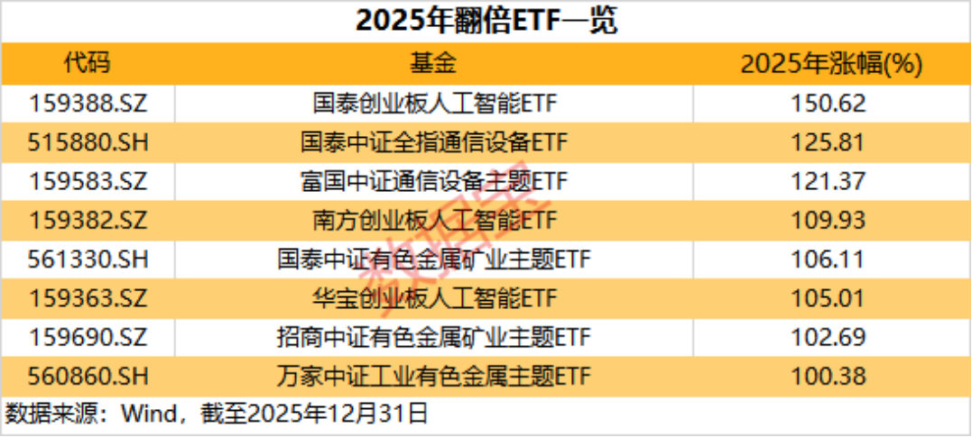 截至2025年12月31日,年度涨幅超过100%的ETF共计8只,均为股票型ETF,翻倍ETF数量创年度历史最高水平。从历史数据来看,2021年至2024年,均未诞生翻倍ETF,2020年仅有2只,再往历史追溯,仅2014年、2009年各有1只。