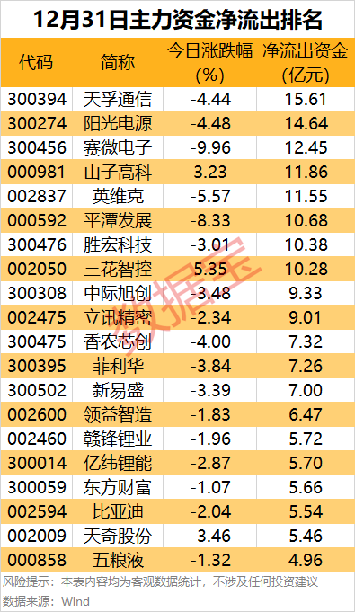据证券时报·数据宝统计,今日(12月31日)沪深两市主力资金净流出270.79亿元,其中创业板净流出119.46亿元,沪深300成份股净流出143.37亿元。