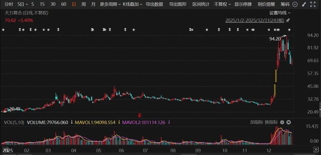 其中,天力复合全年累计涨幅达242.13%。消息面上,近期公司受到核聚变和商业航天两重概念集中催化,引发资金“抢筹”,其股价于12月25日创下历史新高94.20元。2025年商业航天成为资本市场核心热点赛道,政策层面被纳入战略性新兴产业集群,作为西部材料的控股子公司,其具备聚变装置第一壁相关材料的批量供货能力。今年6月,其以联合体成员中标中国科学院合肥物质科学研究院等离子体物理研究所装置内部部件改造第一壁热沉项目,现在相关产品已完成部分交付。
