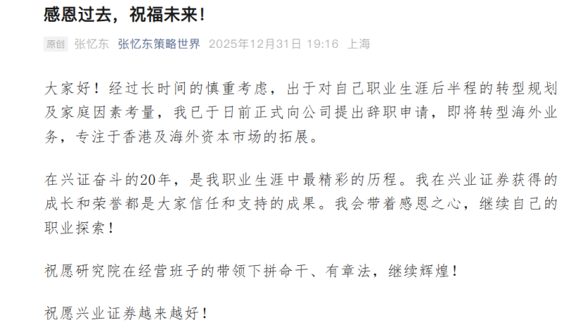 12月31日,著名策略分析师张忆东在个人公众号发布消息,“经过长时间的慎重考虑,出于对自己职业生涯后半程的转型规划及家庭因素考量,我已于日前正式向公司提出辞职申请,即将转型海外业务,专注于香港及海外资本市场的拓展。”
