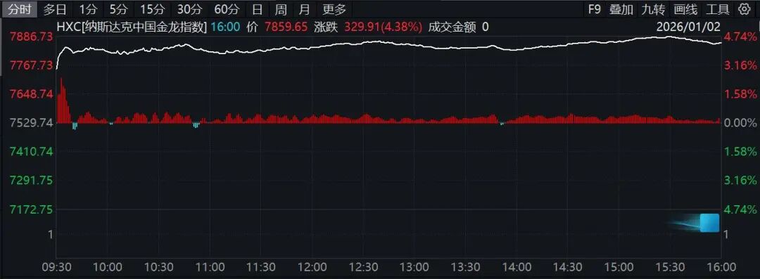 纳斯达克中国金龙指数迎来“开门红”,收涨4.38%,本周累计上涨2.23%。