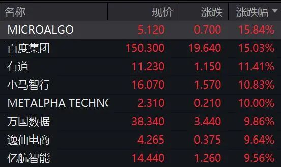 明星中概股普涨,百度收涨15%,哔哩哔哩、网易涨超7%,阿里巴巴涨超6%,京东涨近3%。
