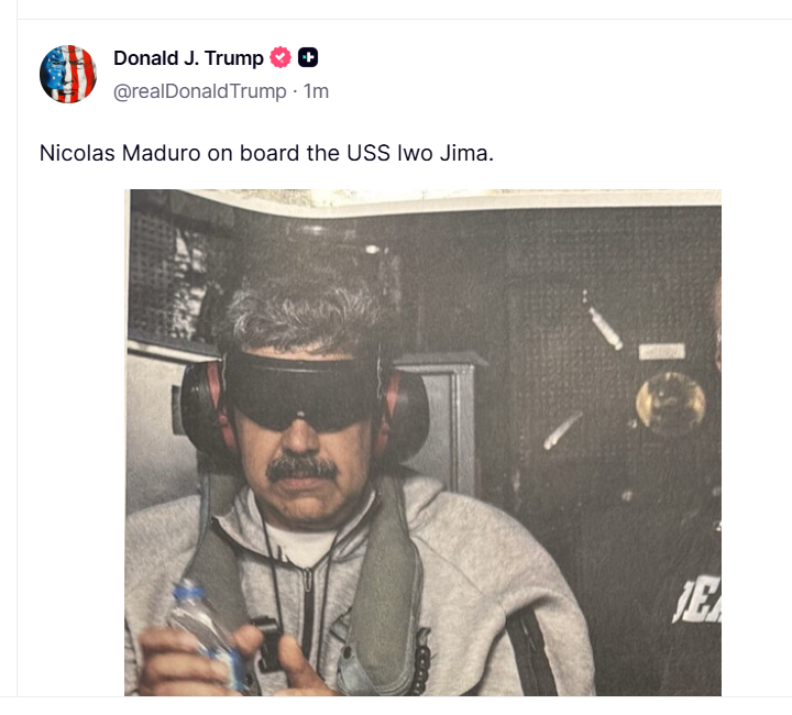 稍早时候,特朗普在社交媒体上发布马杜罗戴手铐、双眼被蒙住的照片,称他现在人在美国军舰“硫磺岛”号上。特朗普在发布会上说,马杜罗夫妇将被送往纽约,面临美国司法审判。美方指控他们对美国“发动致命的毒品恐怖主义活动”。