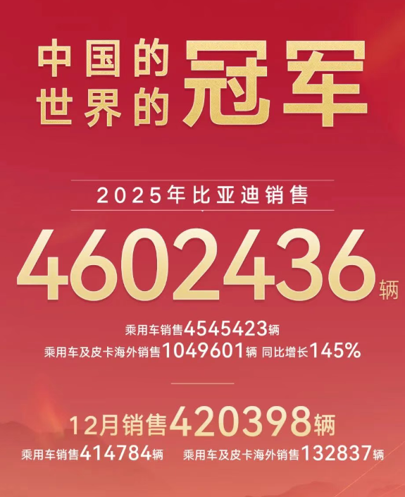 1月4日晚间,比亚迪、长安汽车、北汽蓝谷等披露了2025年12月产销报告,吉利汽车还设立了2026年销量目标,龙头企业海外销售亮眼,造车新势力也突破了多个销量里程碑。