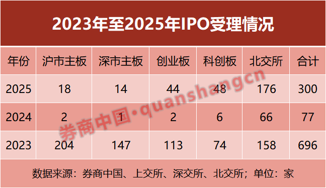 2025年IPO市场迎来转折,出现明显回温。根据券商中国记者统计,全年沪深北三地交易所新增受理IPO企业合计300家,相比2024年的受理数量增近3倍。