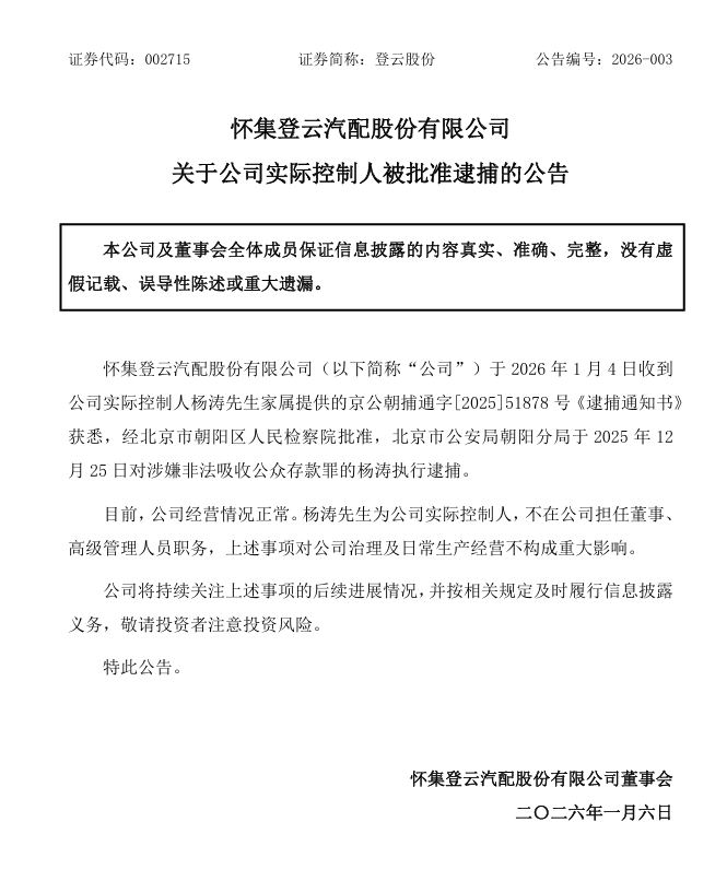 1月5日晚间,登云股份(002715)披露公告称,公司于1月4日收到公司实际控制人杨涛家属提供的京公朝捕通字[2025]51878号《逮捕通知书》获悉,经北京市朝阳区人民检察院批准,北京市公安局朝阳分局于2025年12月25日对涉嫌非法吸收公众存款罪的杨涛执行逮捕。