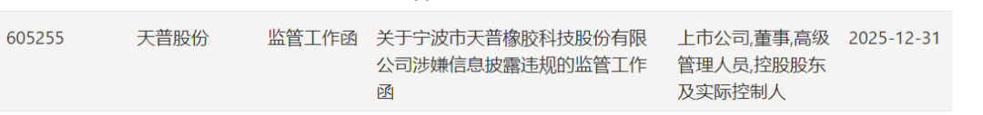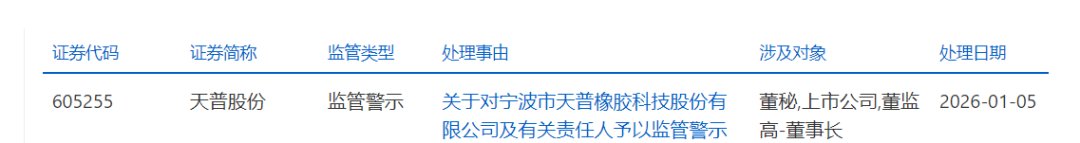 1月5日,上交所发布《关于对宁波市天普橡胶科技股份有限公司及有关责任人予以监管警示的决定》,这是2026年沪市首份监管警示决定书。