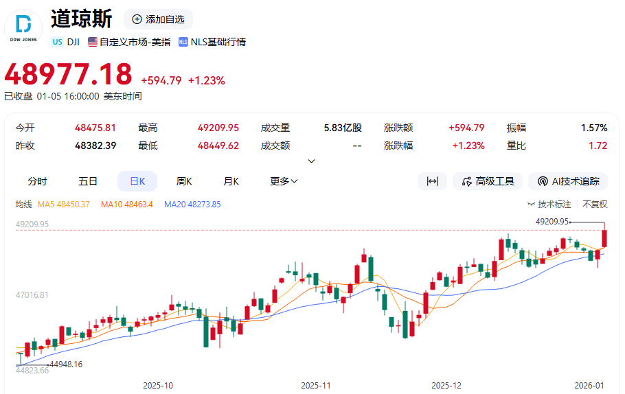 当地时间周一,美股三大指数集体收涨,道指涨1.23%,盘中首次突破49000点,再创历史新高;纳指涨0.69%,标普500指数涨0.64%。