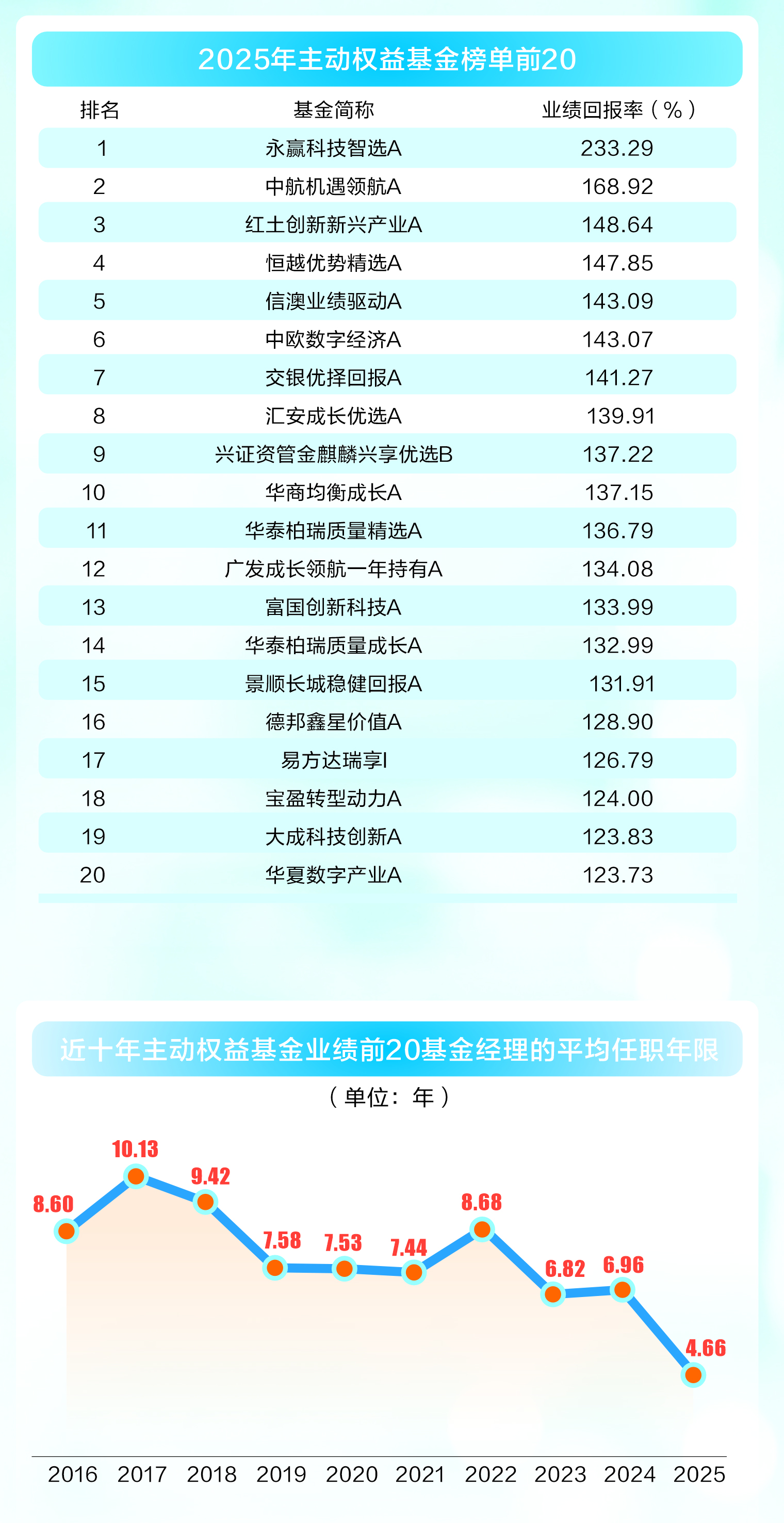 在平台化的投研体系中,基金经理的年龄与从业经验不再是决定产品业绩的核心变量。从基金经理特征来看,从业年限趋短趋势显著。数据显示,2025年业绩排前20名基金的基金经理平均任职年限为4.66年,为近十年来最低值,如永赢科技智选基金经理任桀、华泰柏瑞质量精选基金经理陈文凯均为新生代力量,前者从业年限仅1.18年,2024年10月末才正式接管产品;后者从业年限也仅2.43年。