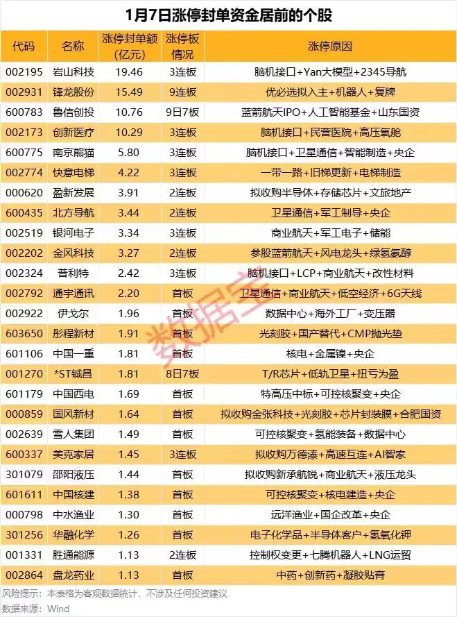 以封单金额计算,岩山科技、锋龙股份、鲁信创投、创新医疗等涨停板封单资金较多,分别有19.46亿元、15.49亿元、10.76亿元、10.29亿元。从封单力度(封单量占流通A股比例)来看,锋龙股份、快意电梯、创新医疗等力度较大,分别为18.24%、12.12%、8.63%。