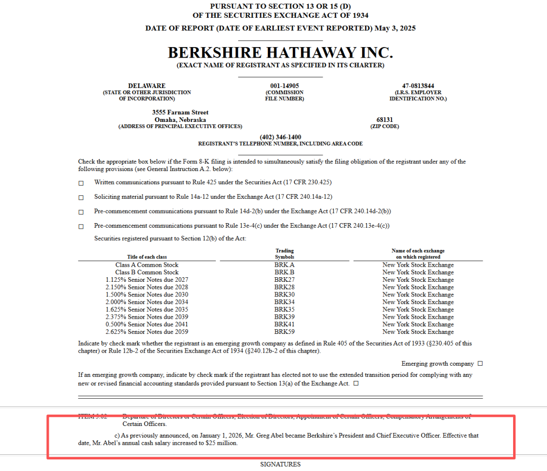 伯克希尔公司周二(1月6日)提交的一份监管文件中披露,新任首席执行官格雷格・阿贝尔的年度现金薪酬将达到2500万美元,这一数字远超其前任巴菲特数十年来担任该职务时10万美元的年薪。