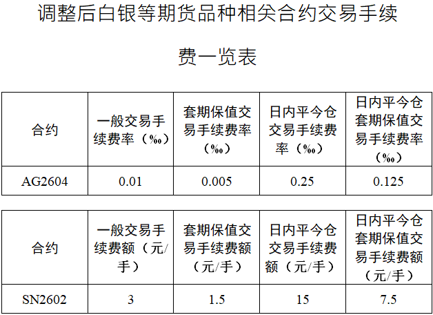 人民财讯1月7日电,上期所发布关于调整白银等期货品种相关合约交易手续费的通知。自2026年1月9日交易(即1月8日晚夜盘)起:白银期货AG2604合约日内平今仓交易手续费调整为成交金额的万分之二点五。锡期货SN2602合约日内平今仓交易手续费调整为15元/手。