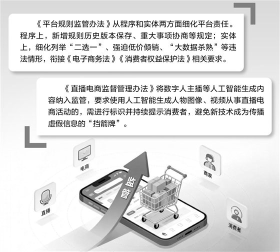日前,市场监管总局与国家网信办联合发布《网络交易平台规则监督管理办法》(以下简称《平台规则监管办法》)与《直播电商监督管理办法》,剑指“仅退款”“全网最低价”乱象及直播电商假冒伪劣、虚假营销等突出问题。