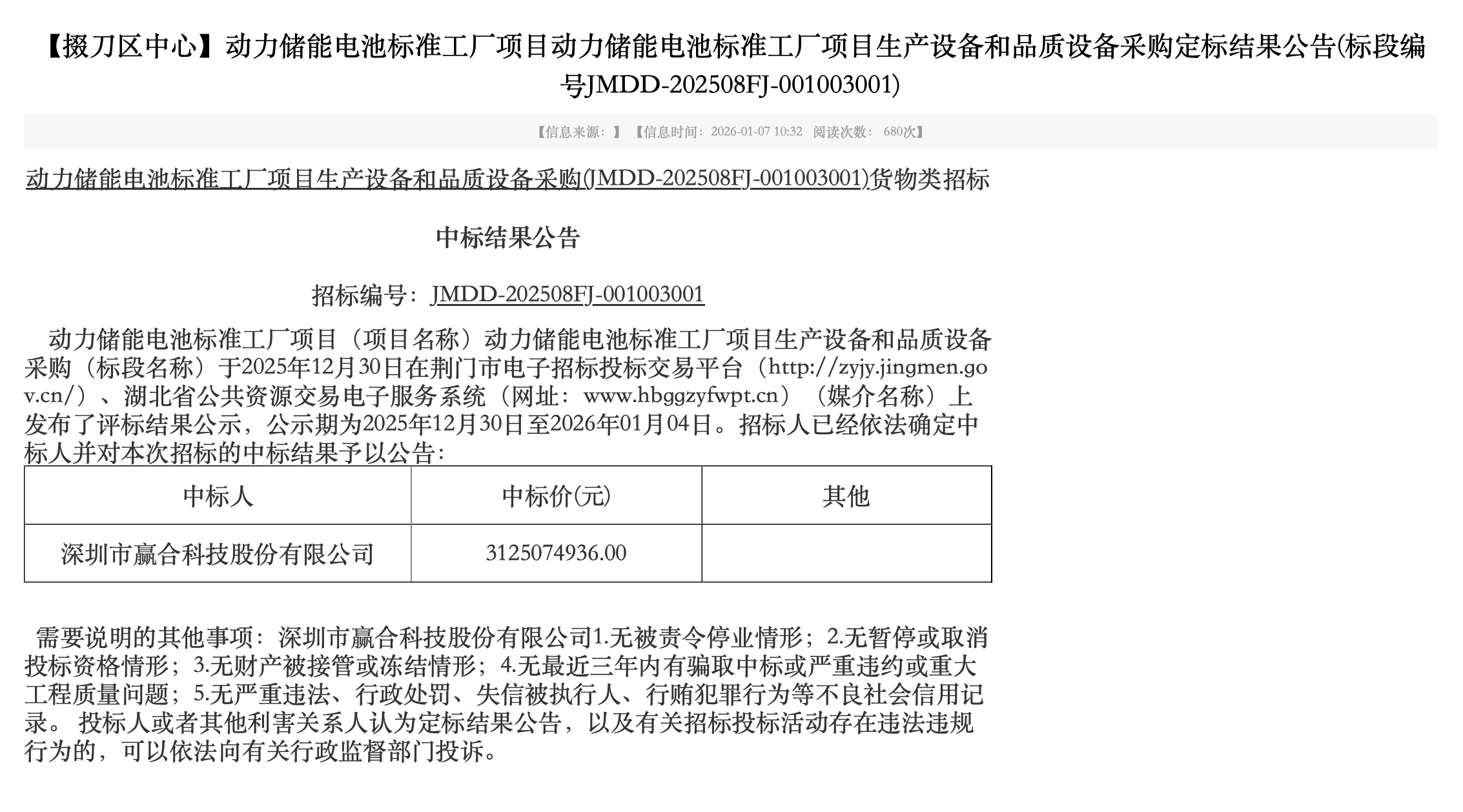 人民财讯1月8日电,荆门市电子招标投标交易平台发布《动力储能电池标准工厂项目动力储能电池标准工厂项目生产设备和品质设备采购定标结果公告》。招标人为荆门亿纬新能源科技有限公司。中标人为深圳市赢合科技股份有限公司,中标价为31.25亿元。