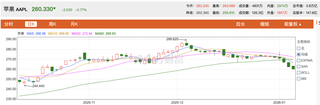苹果在2025年股价累计涨幅约9%,但年末以来持续承压,股价从12月初的288美元/股的高点逐步回落。过去五个交易日,苹果股价已累计下跌了逾4%。