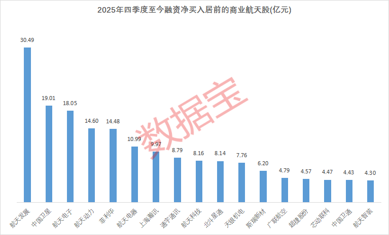 证券时报·数据宝梳理了2025年四季度以来(截至2026年1月7日),融资资金净买入居前的商业航天股,金额在4亿元以上的个股共17只。