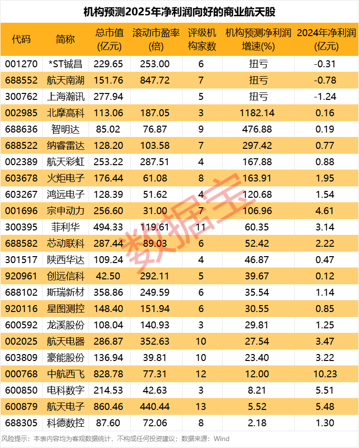 根据3家及以上机构一致预测,23只商业航天股净利润将同比改善。机构预测北摩高科、智明达、纳睿雷达、航天彩虹、火炬电子、鸿远电子、宗申动力2025年净利润有望实现翻倍,菲利华、芯动联科等净利润增速有望超过50%。