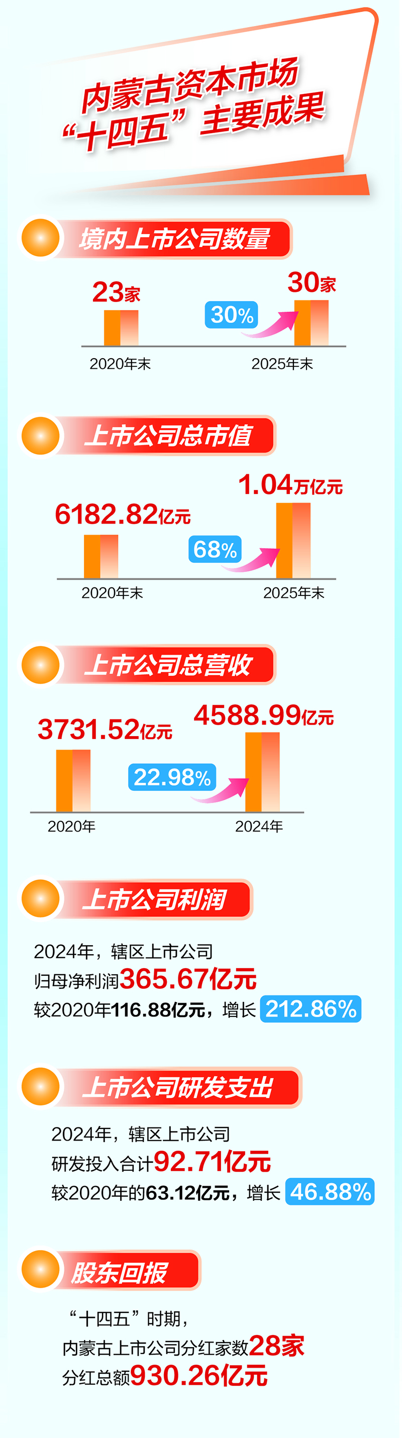 投资者获得感显著增强。“十四五”时期,内蒙古28家上市公司现金分红930.26亿元,是“十三五”时期的两倍,分红比例位居全国前列;伊利股份连续15年分红累计超200亿元。推动辖区上市公司开展股份回购52.26亿元,推动上市公司大股东及相关人员股份增持28.26亿元,彰显长期发展信心与价值认同。